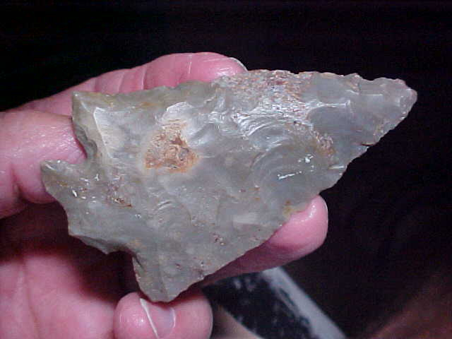 One basal corner away from being a $350+ Decatur (it isn't the fractured base variety. This Warrick County, Indiana, point/ collection was stored for decades--unless it's in a creek pieces like this 3&3/16" by 1&7/8" Decatur simply aren't found anymore--not this close to intact, anyway, plowing doesn't go deep enough. The basal corner nick is Early Archaic use-made, as is the very slight wear to the very tip. Please understand, if I sell a piece I'll say up-front if there is something, some feature that's been use-worn, or dinged--I'd much rather someone buy a piece with their eyes open, know two things: the condition described as accurately as I'm able, and that what they buy is guaranteed authentic for as long as I'm alive (hope to reach 100 some day, lol). Shipping on this fine point is $8.00 due to new postal rates, and I welcome payments only by check, cash, or money order--I do not use paypal--Roy A.