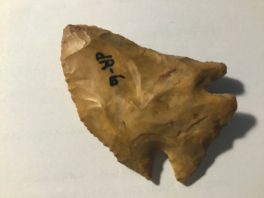 This is a very pretty curved knife, made of Jasper and found in Jasper County by Doug Weeks. Edges show use wear, probably an Ellis Point. I have the shipping and will guarantee authenticity and satisfaction.