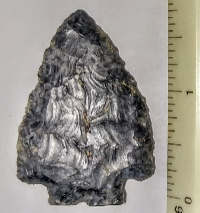 This small Decatur point is made out of glossy Coshocton flint and is well flaked. It was found in Knox Co., Ohio and comes with a Tom and Josh Davis COA. It was graded as a G7.