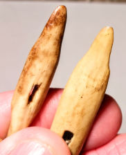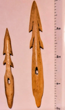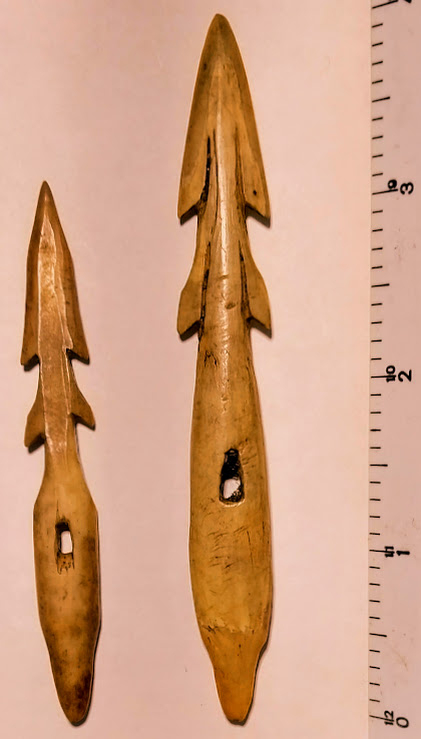 This is flawless pair of Eskimo Carved and Polished Fossil Bone Detachable Harpoon Heads. These were mounted on spears with a line tied to the detachable harpoon head for retrieval. Once the spear had driven the head into a fish or seal, the head would detach and the hunter could pull the fish or seal in with the rope and not risk losing the valuable wooden spear shaft. Found on St. Lawrence Island, Alaska.