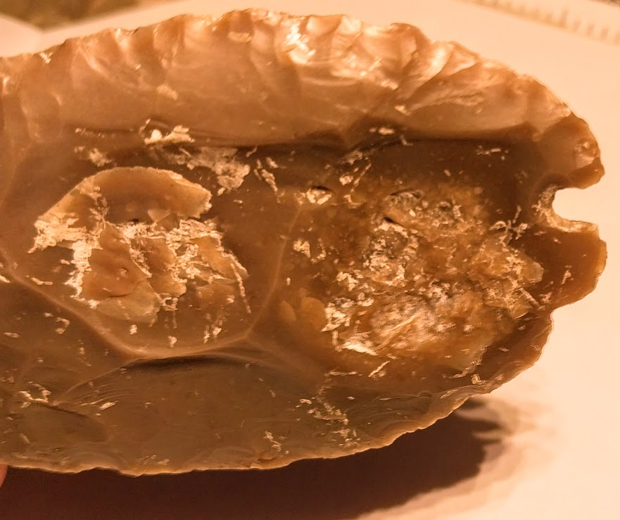 This is a beautiful example of an extremely thin, Base Tang Knife made out of semi-transparent Root Beer Flint. It was found in Llano Co., Texas and comes with a Dwain Rogers COA. The only thing that keeps this piece from being an extremely high-priced artifact is that is has two fire pops on the reverse side.
