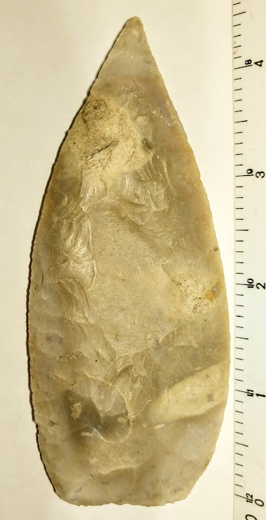 This ultra-thin, semi-translucent Friday Knife is made from a mottled gray/tan chert. It was found in Bell Co., Texas and comes with a Dwain Rogers COA.