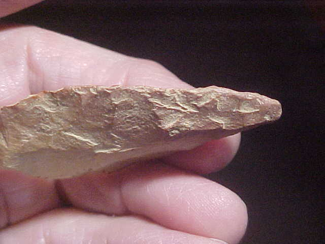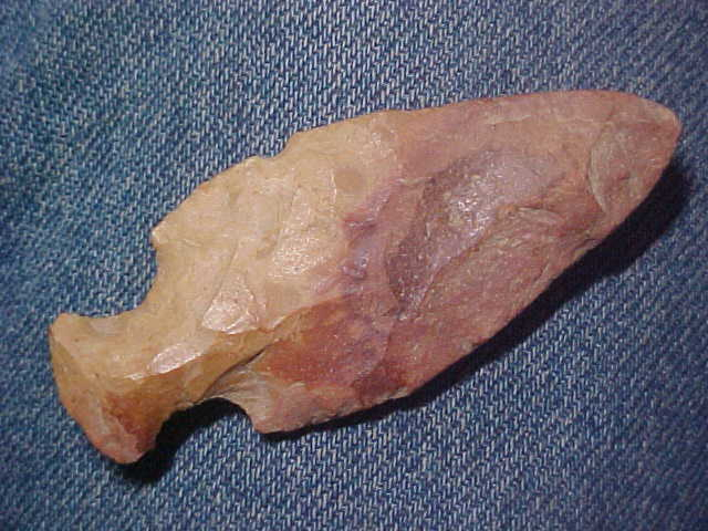 A Table Rock that's been in my collection a couple decades--found on a lake shore in the western part of the state--probably Trigg County as I don't know how widely the finder & family ranged. The Table Rock (or Bottle Beck if you prefer that term( is made of a colorful river-found Jasper2&3/4" by 1&1/8", a balanced 3/8" max thickness in the hafting area. The crevices of the jasper still hold soil deposits--clean if if you wish, I like the patina exactly as it is. Interesting feature--the tip was used as a drill, the edges are completely worn smooth, the rotation of the point (as a drill) wore away ANY sharp edges all the way down to the tiny notch indented on one blade edge, but mostly so in the top 1". A very interesting Mid Archaic point, lifetime guaranteed real. Shipping is $8.00 with checks or M.O.s welcomed. Sorry, I do not use paypal--Roy A.