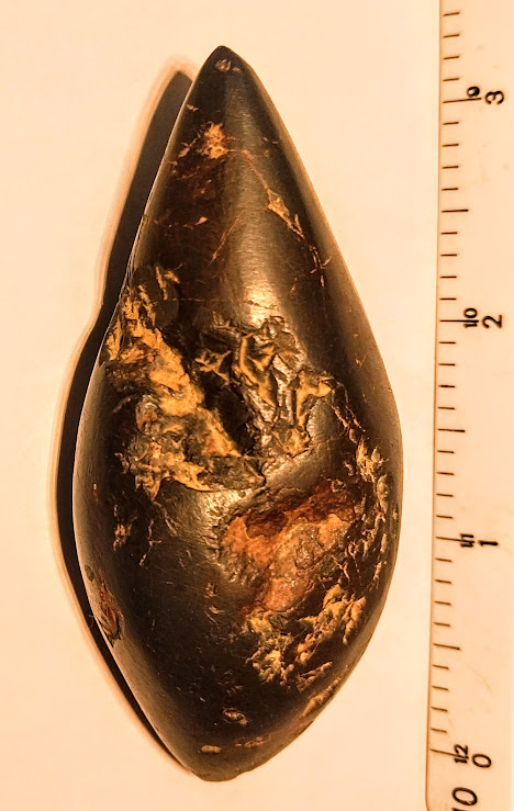 This heavy Hematite Plummet was found in Illinois. It comes out of the Floyd Ritter collection. Many plummets were made of hematite (a hard iron ore) indicating that weight was important in their usage which in turn suggests that their primary purpose might be net weights or weights used on looms in the weaving process. Hematite artifacts are highly sought after by collectors.