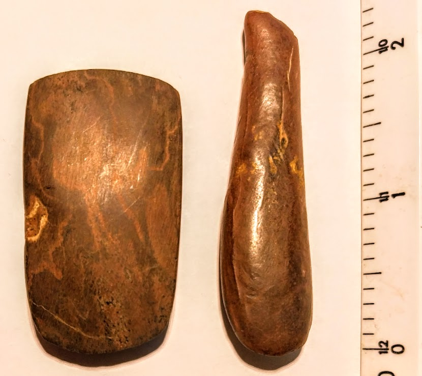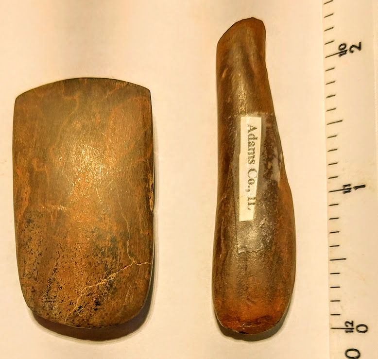 These two artifacts consisting of a small Hematite Celt and a small Hematite Pestle were found in Adams Co., Illinois. Hematite artifacts are highly sought after by collectors.