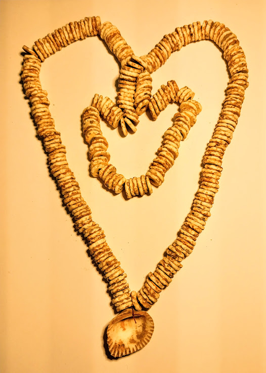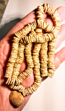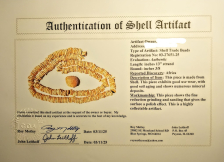 This Necklace is comprised of beads made from Ostrich egg shells covered in red ochre. The string is 27" long with over 300 individually drilled, ground, and shaped beads with a delicate shell pendant attached. The necklace originates in Africa and comes with a Roy Motley COA.