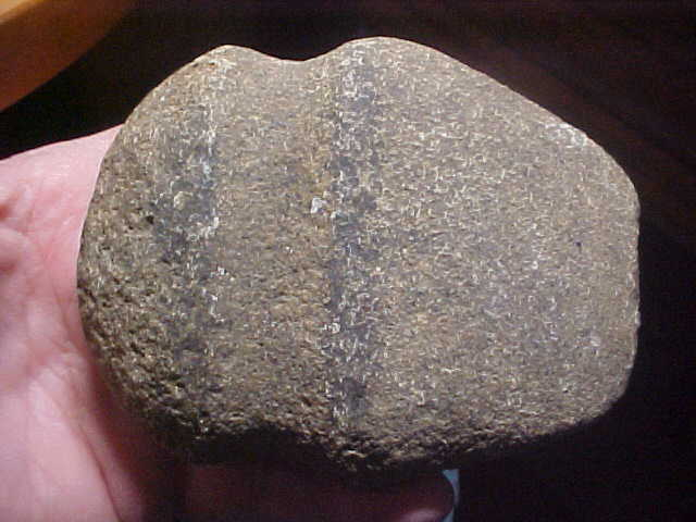 Priority Mail shipping, $13.00 on this Wabash or Edwards County, Illinois, Early Archaic Full Groove Axe--one strong piece of granite, deeply patinated. My caliper reads 4&5/8" by almost 3&3/4", but proportional in thickness, only 1&3/4"--heavy, though. Haft this stone, swing it again and again, you'd have a good case of tennis elbow. The axe does have some use roughness on the bit, worn from many hours of use--not what would qualify as damage, just wear--photo should show it as clear as I can get my camera to focus. The now deceased finder had more axe & celt producing sites than any collector I've come across. The auctioneer knew the creek the man hunted, info that'll go to the next owner. I welcome checks or M.O>s, but please note I do not take paypal--Roy A.