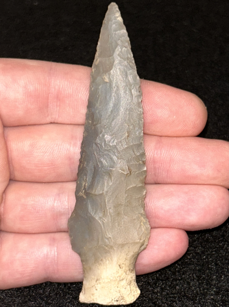 An outstanding Elk River found in Harrison County, Indiana. Made from semi-glossy grey-brown Hornstone. In great condition with excellent size and flaking. Ex: Harris collection.