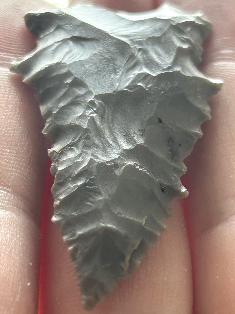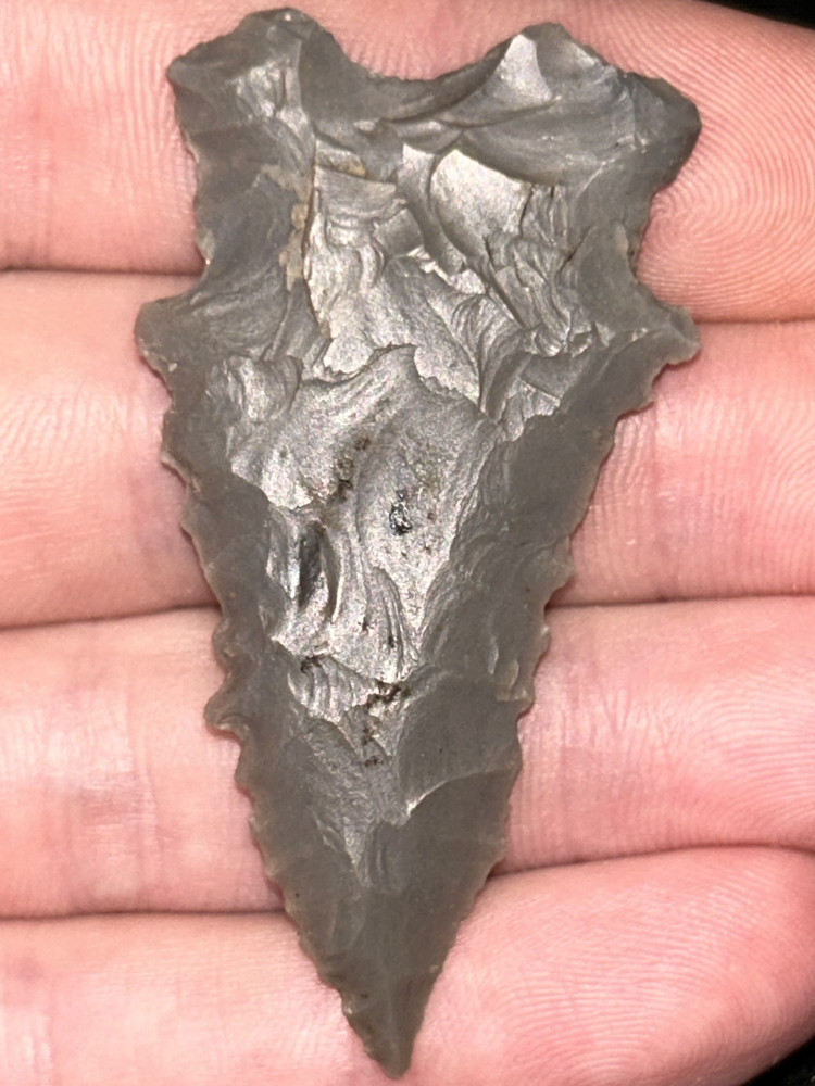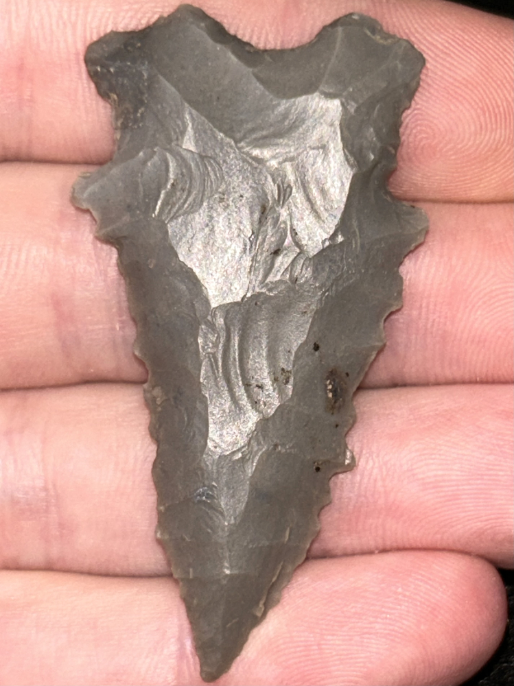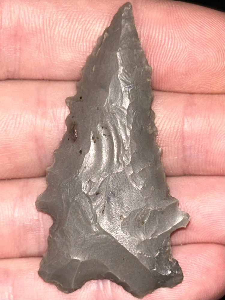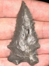 An excellent MacCorkle found in Hardin County, Tennessee. Made from high grade glossy grey Hornstone. Very well made and finely flaked with serrated edges.