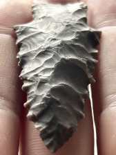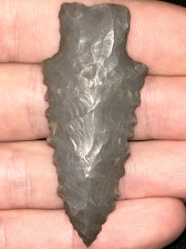 A fantastic Heavy Duty found in Washington County, Indiana. Made from high quality glossy grey Hornstone. Nice form and finely flaked with a sharp tip and serrated edges. Ex: A Johnson and Dr Peter Ward collections.
