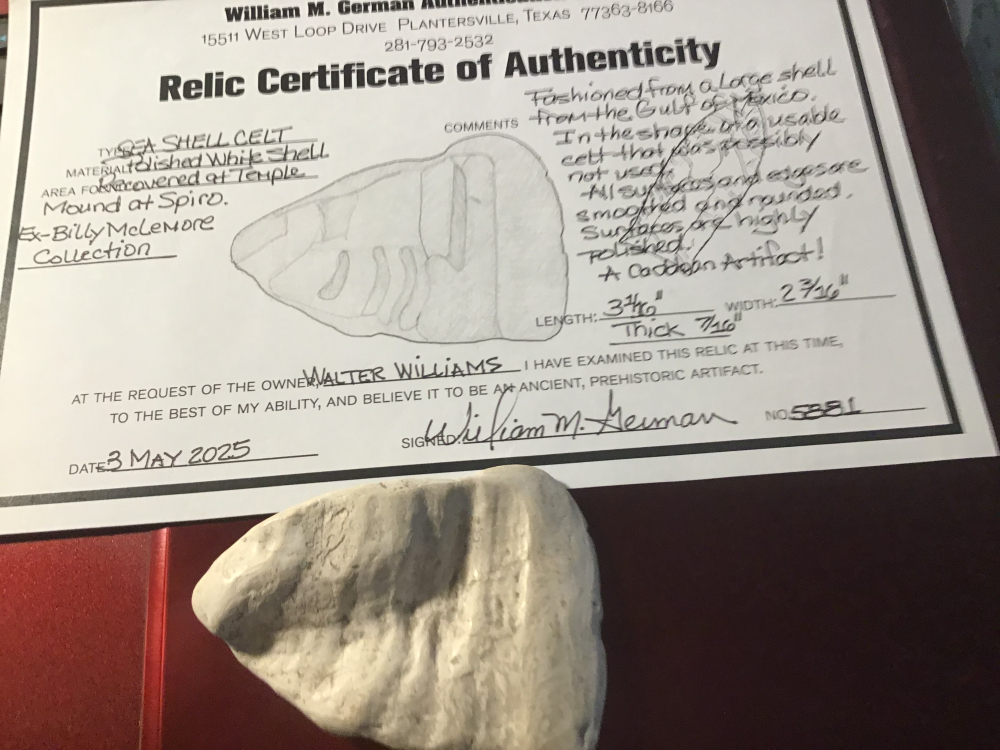 Found at Spiro Mounds and part of the Billy McLemore Collection this is a fine example of rare artifact. Part of the Caddoan Culture, this is a fine artifact and comes with a Bill German coa. I have the shipping.