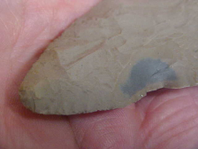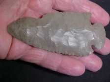 If it takes you more than one glance to say "That's real" I'll be very, very surprised. Length is a very long 3&7/8" by 1&13/16", and at the absolute thickest spot on the medial ridge (a tiny stack in the flint) my caliper closes on 7/16". While the Warrick County, Indiana, Dove was bevel sharpened there weren't a great number of sharpenings of the blade, the bevel is 'moderate', not a sharp angle that would have shown repeated blade edge sharpening. Note the interesting rounding of the Dove base--it was original to the piece, the rounding wasn't a result of basal salvage--first time I've seen a Dove made this way in my half century of collecting--learn something new all the time (as one should). Barb end chips, slight use-made damage are 100% patinated--the rounded tip also is from the 7500BP Early Archaic usage. Now why the blade edge 'ding' still shows a dark center is something no one could fully answer; at its outer edge it's patinated that grayish-brown, same as the color of the big chip on the inner side--only the center of the chip shows dark flint. "Just the way the flint patinated (with time) is the only answer I can provide--ain't new, lol. I welcome checks or money orders, but on this store you cannot use paypal--sorry--Roy A.