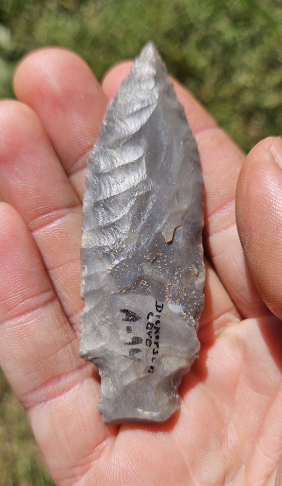 Nice elk river point from Dickerson Cave in Todd County, KY. Very nice example of the type. Measures 3 inches long with a needle tip