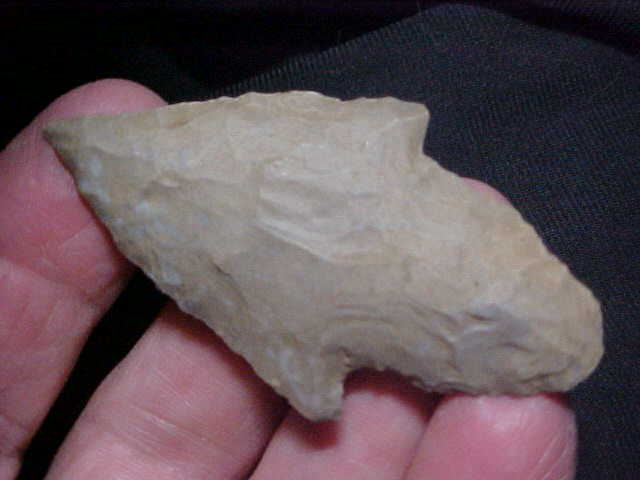 One look at that base and you know there was (to start with) a lot more blade--An Adena knapper would never make a base that large unless there was a corresponding large flint blade above it--sharpened down with use, the entire knife now measures 2&5/8" by 1&7/16"--with a 3/8" max thickness, the thickest part being nearer the tip. When the upper blade holds the thickest measurement it's a simple jump to knowing the blade was considerably larger. Made of a weathered grade of Indiana Hornstone, the piece shows almost a creek find-type patina. Because the piece came with some Perry County, Indiana, Adenas (my old hunting grounds), I know the form, the material, and can guarantee the authenticity. The one snapped-off barb is an ancient chip, and an impact fracture to the edge right above the missing barb indicates the piece was in use after that barb was broken--price reflects the ancient damage. For the work it took, the Woodland Culture hunter made a very sharp tip to a blade that was both shortened and narrowed--almost a 'burin' the tip is so sharp. Shipping is $8.00, checks, cash, or M.O.s are the payment methods I use. Sorry, I have nothing to do with paypal--Roy A.