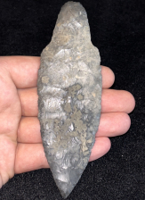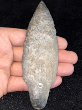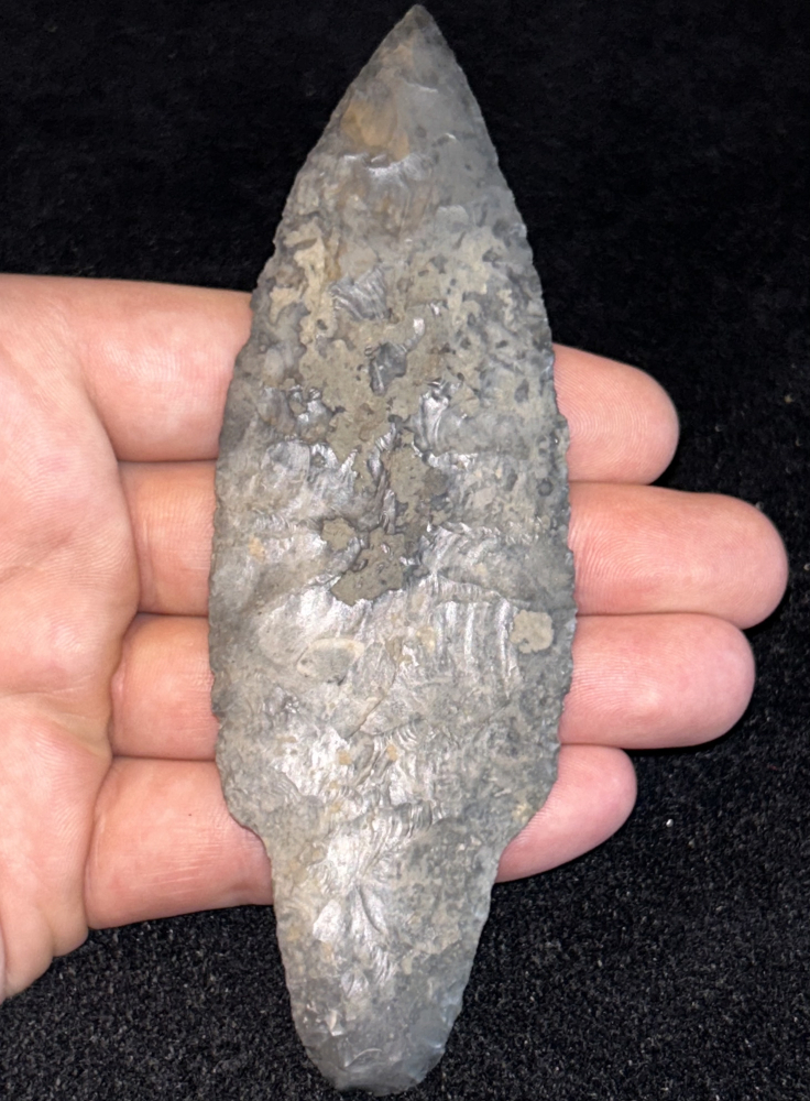 An incredible Adena found in Wood County, Ohio. Made from attractive grey-black mottled Coshocton chert. In excellent condition, extremely thin and finely made with great size. Ex: Charles Strubler collection and comes with Rogers and Jackson COAs.