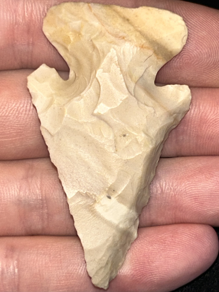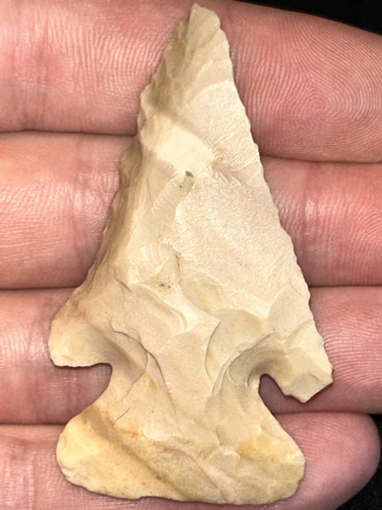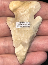 A fantastic Thebes found in Posey County, Indiana. Made from what appears to be well patinated cream colored Derby chert. Great form with steep beveled edges and ground base. Ex: Lance Wolfe and Luke Cord collections.