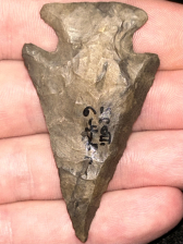 A fine Lost Lake found in Marshall County, Alabama. Made from mottled dark brown Fort Payne chert. Great age with beveled edges and ground base.