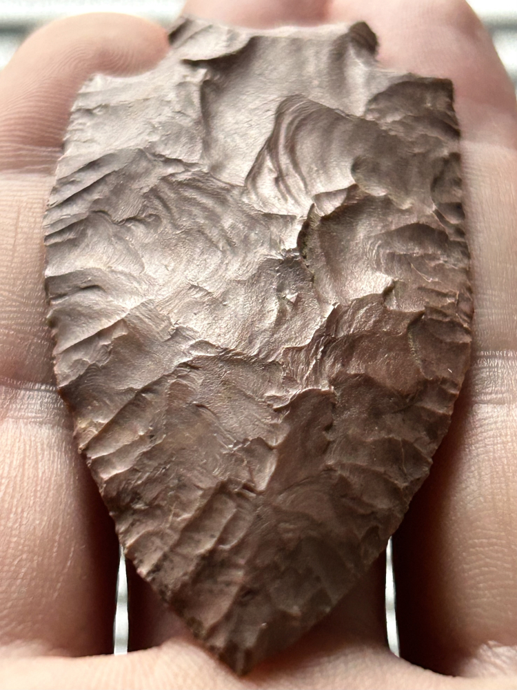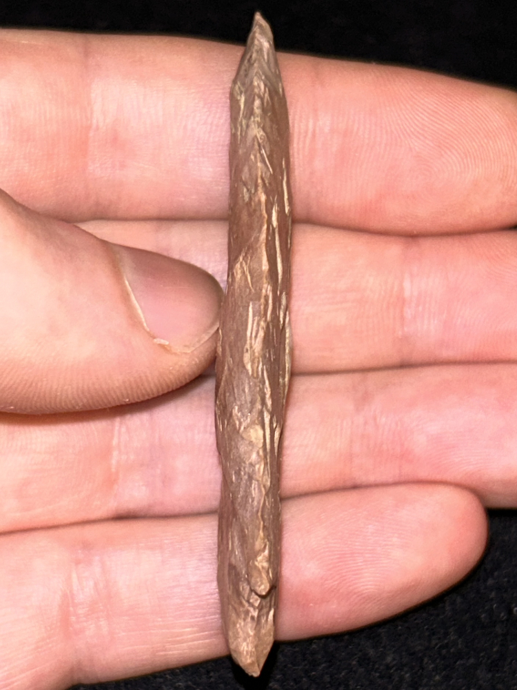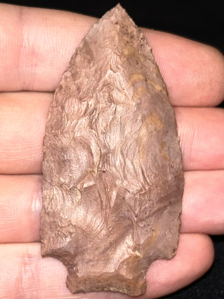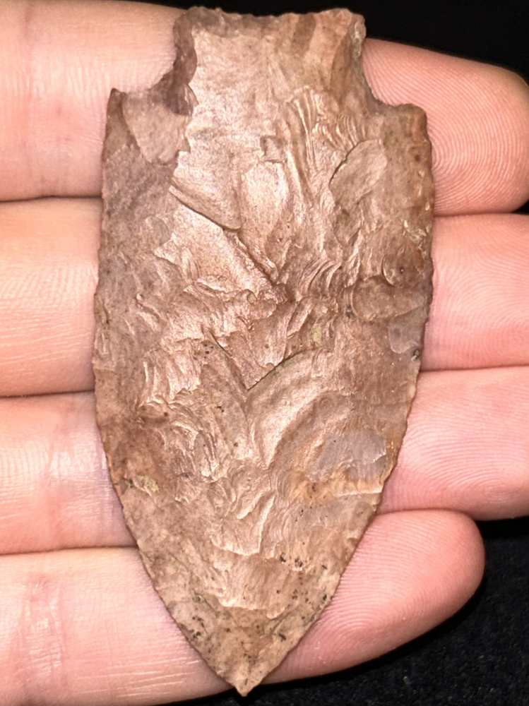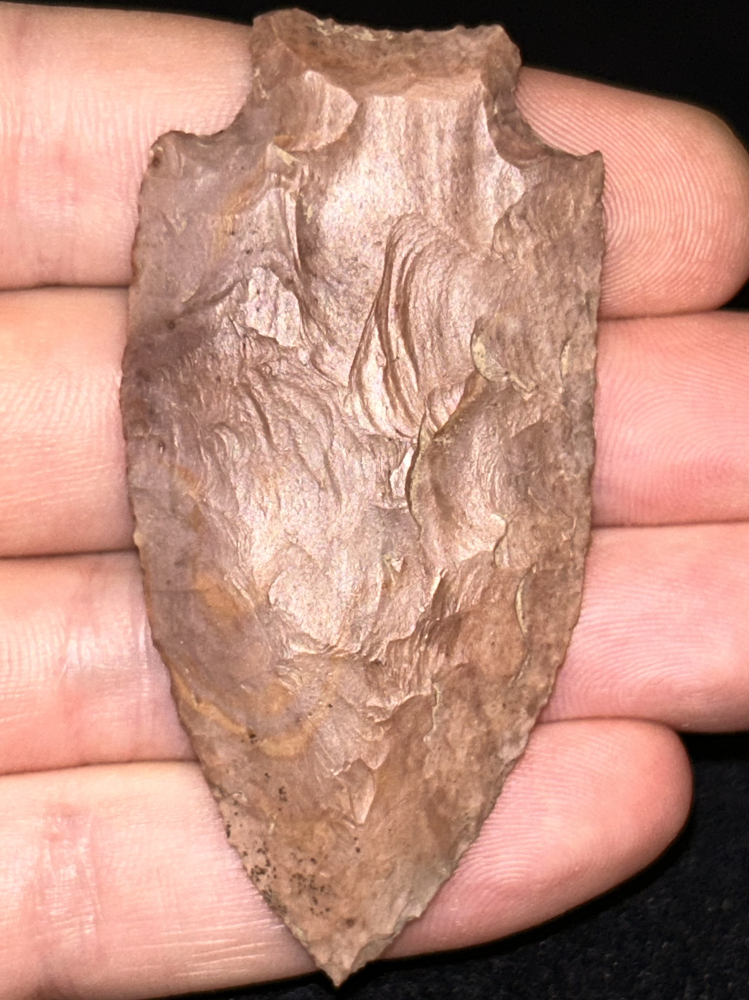 A fine Benton found in Wayne County, Tennessee. Made from glossy pink-red Buffalo River chert. Well made with good symmetry and sharp tip.