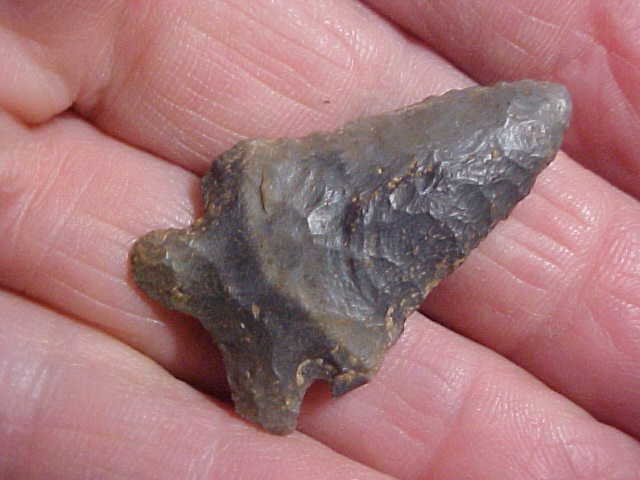 Some collectors will call the point a Pinetree (I would)--some might call the piece a Palmer. As it isn't serrated and the basal edge has only medium-level grinding, I think you could also use a generic "Kirk related dart", your classification be as accurate as a more specific name. The 1&1/2" by 7/8", barely 3/16" thick point is well made of what looks like Sonora Flint, slightly dished-in on one face (see the last photo). The piece was found in Posey County, Indiana, it's been in a family collection long stored away--good color, form, and even better patina. Read that as guaranteed real, period. Shipping is USPS min for a small box, $8.00, checks, cash, or M.O>s are how I welcome payment. Sorry, I do not use paypal--Roy A.