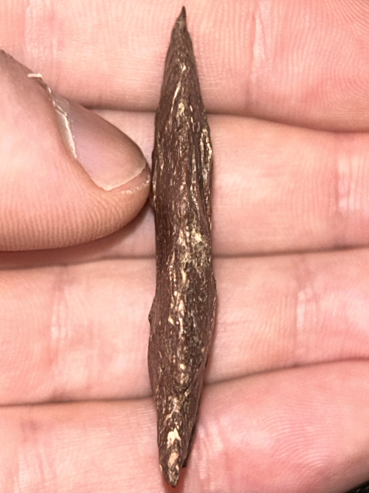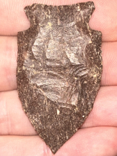 A fine Archaic corner notch found in Harrison County, Indiana. Made from attractive dark red fossil chert. Extremely well made with nice flaking, style, and a sharp tip.