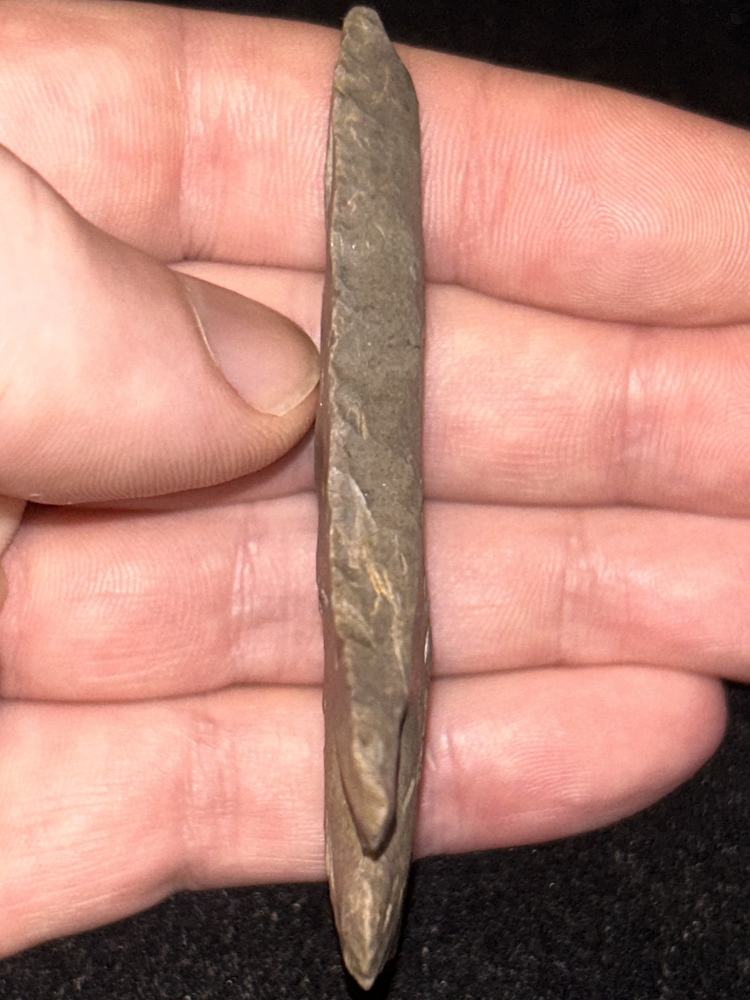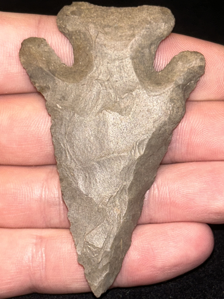 A fabulous Lost Lake found in Lauderdale County, Alabama. Made from heavily patinated brown Fort Payne chert. Great style with nice wide form, steeply beveled edges, and ground base. Ex: Charles Moore collection.
