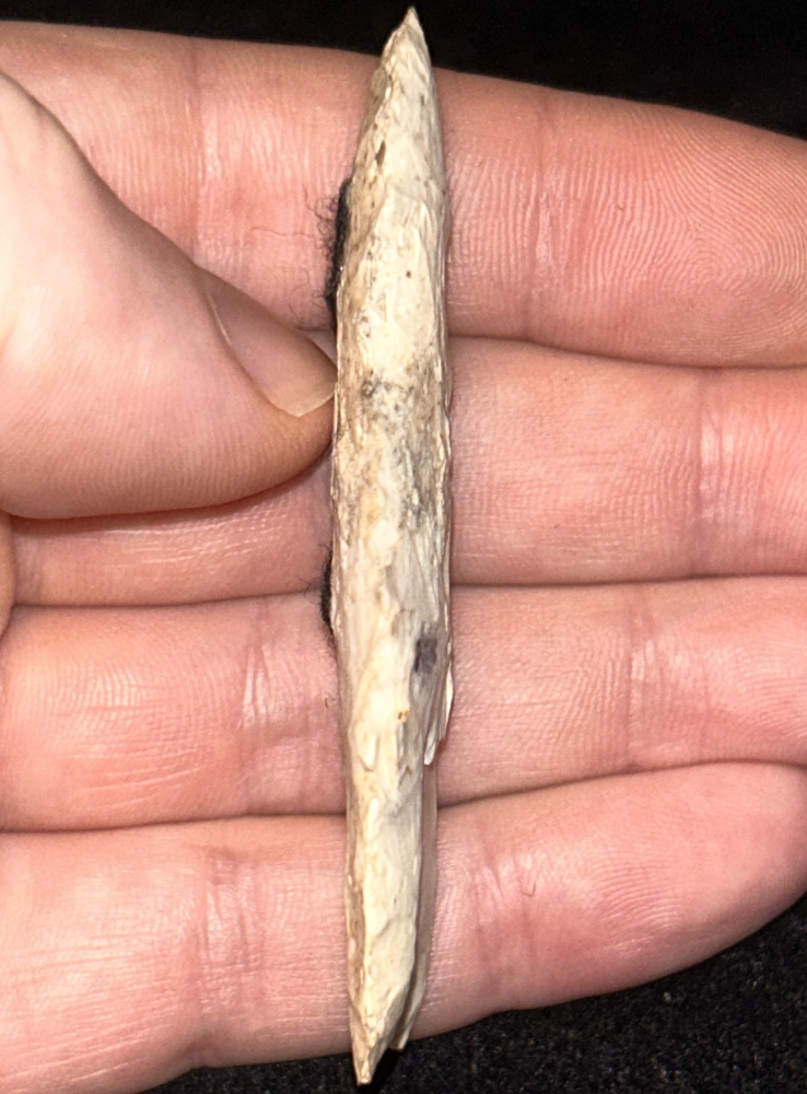 A fine Clovis found in Missouri. Made from well patinated off white Burlington chert. Thin with great workmanship with a nice flute on one side and double fluted on the other. Ex: Walt McIntyre collection.