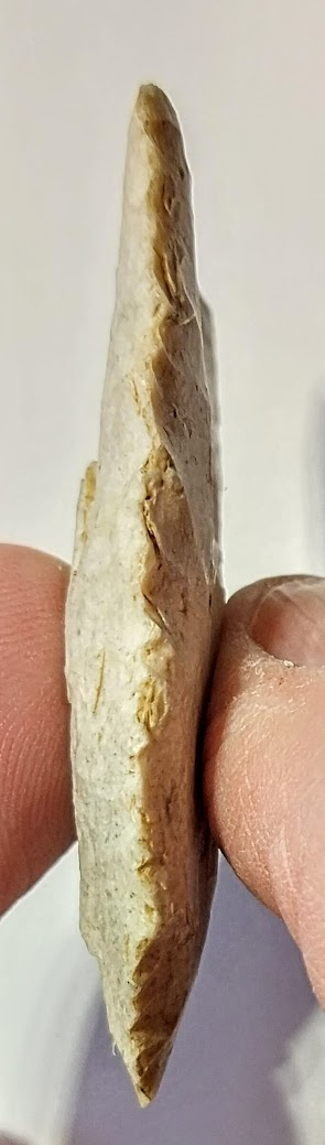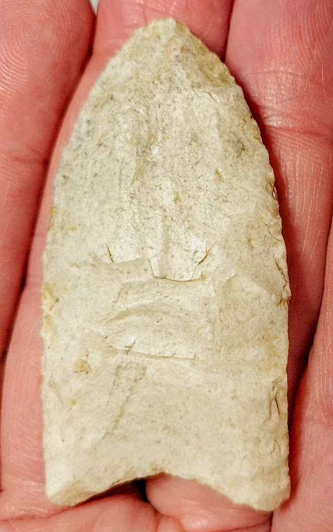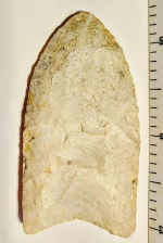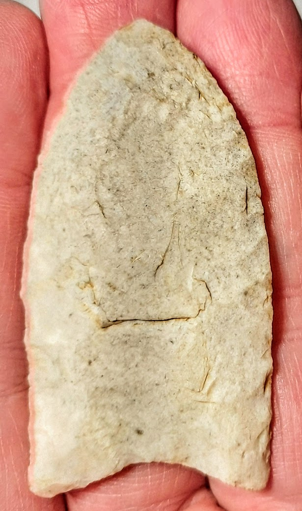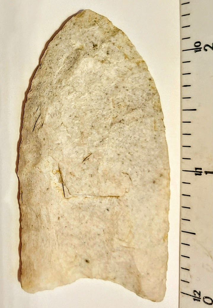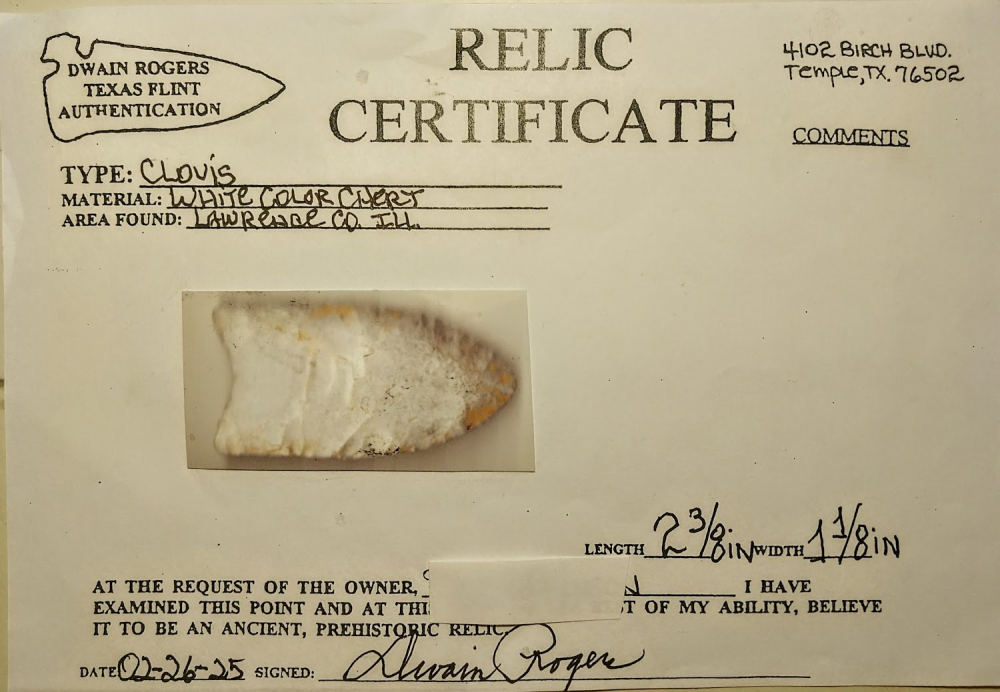 This classic Clovis point is very symmetrical with great flutes. It was found in Lawrence Co., Illinois, and comes with a Dwain Rogers COA.