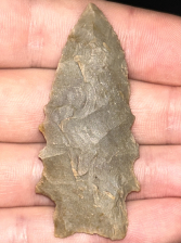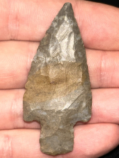 An excellent Thebes found in Dubois County, Indiana. Made from well patinated off white Burlington chert with great mineralization. Very nice style and form with finely flaked beveled and serrated edges.