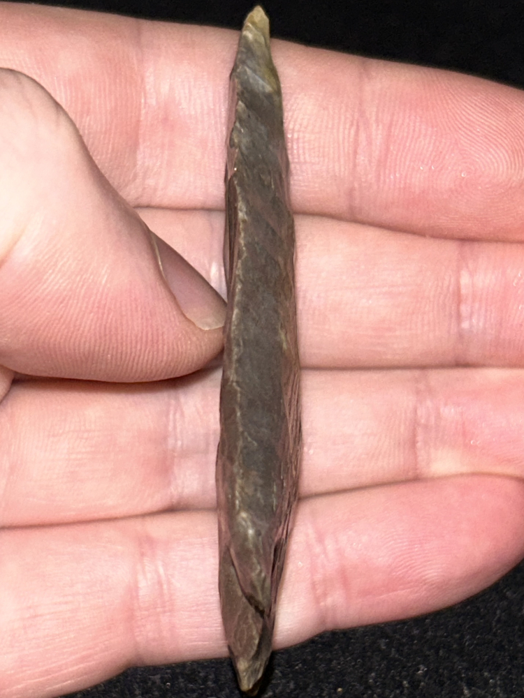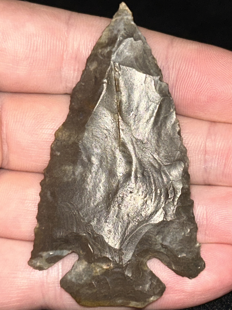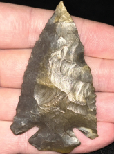 An outstanding Dovetail found in Grayson County, Kentucky. Made from glossy dark brown mottled Fort Payne chert. Superb style and flaking with sharp tip, beveled edges, and symmetrical notching.