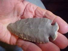 Caliper sits on 3&7/8" by 1&1/2" with a center thickness halfway between 3/8" and 7/16". The notched base is well ground, the Dove base being the off-white cortex of the Indiana Hornstone preform. Note--there isn't a 'center-of-nodule' crystalization, the blue quartz crystals you see where a knapper worked across the nodule center, so this may have been a layer (lense) form of Hornstone out of Harrison County, Ind.--the Dove itself is part of a long-stored Spencer-Perry County, Indiana, collection. Note the upper blade has a shaft scraper indention, and there is slight Early Archaic timeperiod use of the tip as a buffer--you can feel some work polish on the main face. The piece is guaranteed real, period. Shipping is $8.00, with payment by check or money order--I do not use paypal-type payment services--Roy A.