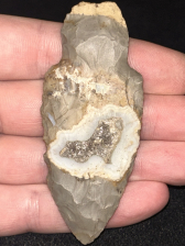 An outstanding Adena found in Indiana. Made from semi glossy grey Hornstone with a beautiful and very unique translucent quartz crystal inclusion. Thin and well made. Ex: Brian Latulippe collection.