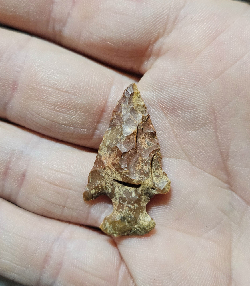 Choice Cienega point from Apache Co, AZ. Nicely made little point on a very pretty mottled reddish jasper. Measures 1 1/8 inches long.