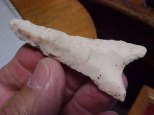 A part of an old (small) Spencer County, Indiana, family collection, this hornstone Lost Lake is 3&1/2" by 1&9/16". The steeply beveled blade is a full 3/8", so you know (based on the sheer number of blade sharpen-and-use cycles) that the hafted knife was once both longer and wider. One barb is salvaged (from use and the sharpening process), it isn't broken, just worn-away--worn in the same way what was likely a sharp tip now shows heavy Early Archaic period use--before the knife was lost. I'll carry that same "worn" label to the ground basal edge--the knife may have been hafted several times, the basal edge slightly altered so it'd fit a handle each time. All that (wear) is part of the 100% guaranteed authentic patina. Hell of a piece, period. $7.00 is the shipping cost. Payment--you have three--and ONLY three options: cash, check, or money order. If none of those three work for you, well, thanks for looking, anyway--Roy A.