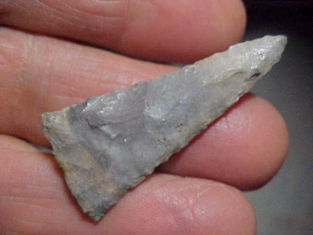 Length of this Indiana Madison point--Mississippian Culture, 1250--1400 common era, is an excellent 1&11/16" by 3/34" width and 3/16" max thickness. It comes from the Vanderburgh County, Indiana, area--once the site of very large Miss. village until something dispersed a thousand people to sites farter west, down the Ohio River in riverbottoms on both sides of the river west of Evansville, Indiana (and Henderson, Kentucky)--you know something more about the area some artifact comes from, you understand more of how it was made, used, and lost. The flint here is kind of a puzzle, it's possibly a nodular flint a knapper found along the river, utilized--it doesn't show the color of Indiana Hornstone or other small deposit local flints. The other possibility I've considered is that the flint was a rock used as a campfire ring, accidental heat altering--the sort of "purplish color" would fit for a flint that had seen heat 'tempering'. Patina is excellent, every detail is guaranteed authentic. Shipping is $8.00, USPS minimum for a small package, and I welcome checks (cash) or M.O.s, but do not use any sort of paypal-type electronic payment--Roy A.