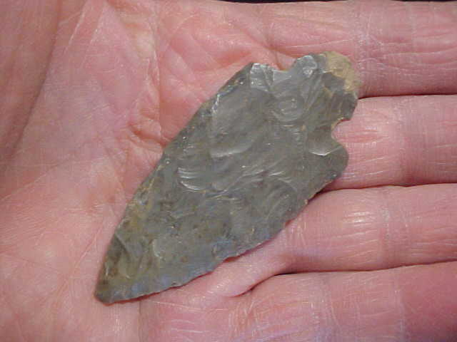 Patina, patina, and more patina. I didn't find out if this was a field or a creek find--the finder passed the piece to his son, and then on to the third generation (also now deceased). The widow knew the collection had been found in various places in Perry and Spencer County, Indiana, s.w. corner of the state. Flint is right (our Harrison County Hornstone), type is right (something like 98% of all Turkey Tails are made of Indiana Hornstone, I've read)--and area, every trait matches for what an authentic Turkey Tail should be. Length is right under 2&15/16" by 1&1/4", with a thin profile, only 1/4" max thickness. One side of the blade saw more use (and sharpening) than the opposite blade edge--you can see it's cut closer to the stem by a small degree--the tip, too, shows ancient (Late Archaic, some 2500BP) use and edge sharpening. The stem edges show some grinding to save the sinew used to secure the knife into a handle (wood or more likely antler--a semi-curved antler which would account for more wear on the main cutting edge. Visualize holding a curved antler, how awkward it'd be to use the edge facing up...much like a steel steak knife). Shipping is $8.00, and payment can be by cash, check, or money order, but please note this store does not use paypal-type services--Roy A.