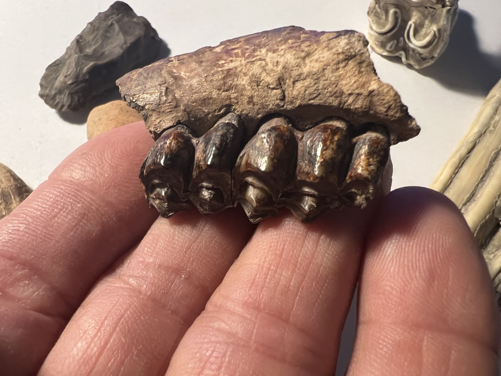 A few interesting finds including what looks like a petrified horse tooth, not sure what it was doing in a camp, but also a buffalo tooth as well as a couple other teeth. . There is a piece of a pipe and a couple of tools, one petrified wood. They make interesting frame fillers. I have the shipping.