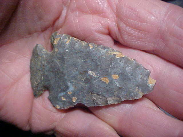 The flint on this Spencer County, Indiana, Lost Lake is the local "Holland Flint"--chalcedony, really, a very hard silicate material, but on this Lost Lake there are 'vugs'--cavities, that is, filled with iron deposits. Length is 2&7/16" from the VERY heavily ground basal edge to the small cavity that forms the tip--the flint had to have been a bear to knapp, you'd think. The Early Archaic knapper manages, excellent bevel sharpening, that parallel-type flaking seen only in Early Archaic culture points--funny, but beveling a blade, that technique simply died-off after the 7500BP era--why? This piece comes from al old family collection, passed from grandfather on down. It's guaranteed real, period. Shipping is included with the price, and checks or M.O.s are how I take payments. Sorry, I use no sort of paypal-type payment systems--best to all for 2026--Roy A.