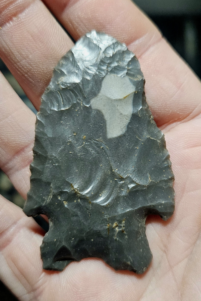 Real nice Maccorkle from Spencer County, Indiana. Made from gorgeous highly glossy hornstone with a nice white patch. Measures 2 1/2 inches long. Great piece