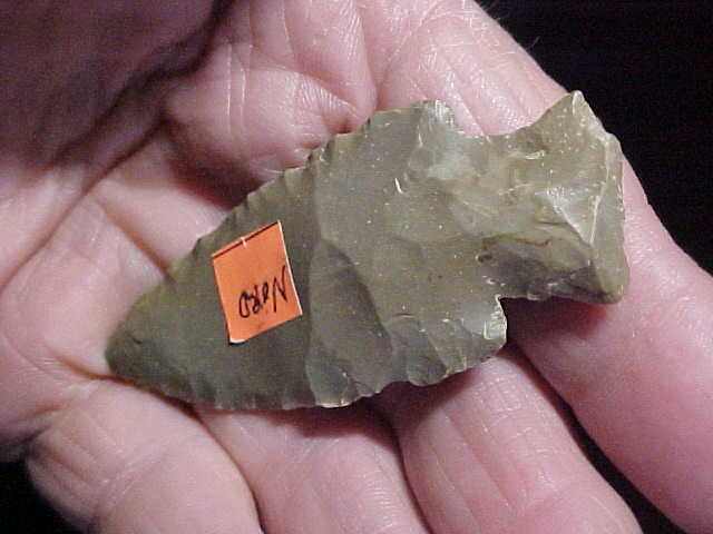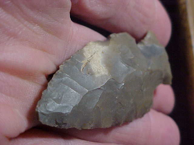 One of those myriad of Hopewell types (Hopewell cluster) from along the Ohio River, Spencer or Perry County, Indiana--length is 2&13/16" by 1&3/16". Being percussion knapped--see the larger, rougher flake scars, the thickness is some 7/17" thick. The point was a hafted knife, not a projectile, obviously--a "Steuben" point style, related to the much thinner Lowe Points of the Late Hopewell--about that time Hopewell (as we call them) were just starting with bow-and-arrow technology, so after this blade style you see much finer worked, much thinner point types--Bakers Creek, Jacks Reef, and finally triangles, true arrowheads. They still had to have hafted knives, so this style likely hung-on for much of the Late Hopewell period--NICE piece of weathered hornstone, REAL. Shipping is $8.00, checks, cash, or M.O.s welcomed, but I do not use paypal-type payment services--Roy A.