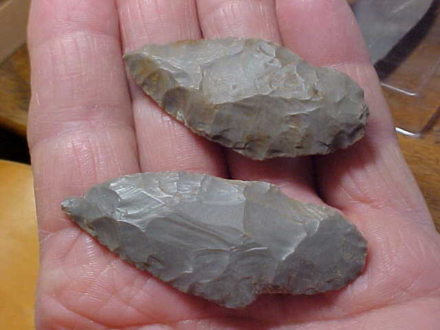 Two Indiana Hornstone Adenas off a beach in Perry County, Indiana--Ohio River-washed-out points from beachcombing many years back. They're so patinated there is simply nothing but "No brainers" I can as to authenticity. Lengths are 2&1/2" on the piece with a "burin tip", and 2&1/4" on the slightly shorter Woodland point. Each has a large enough stem that guessing original length, well, double the present length, you'll be very close. They're real, period. Shipping is $8.00 with checks, cash, or money orders the three ways I welcome-in payments, but please note I do not use paypal-type electronic payments--Roy A.