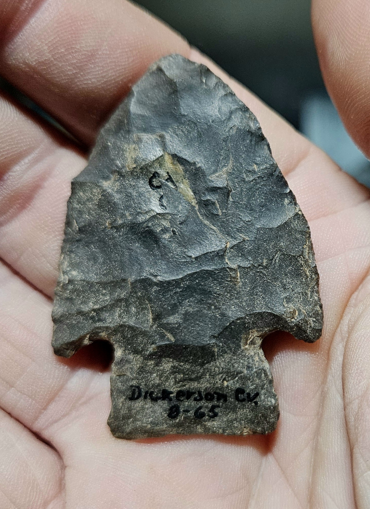 Nice big slough point from Dickerson Cave in Todd County, KY. Extremely thin and very well made with minor ancient resharpening. Measures 1 7/8 inches long.