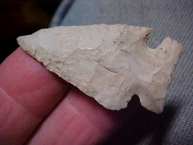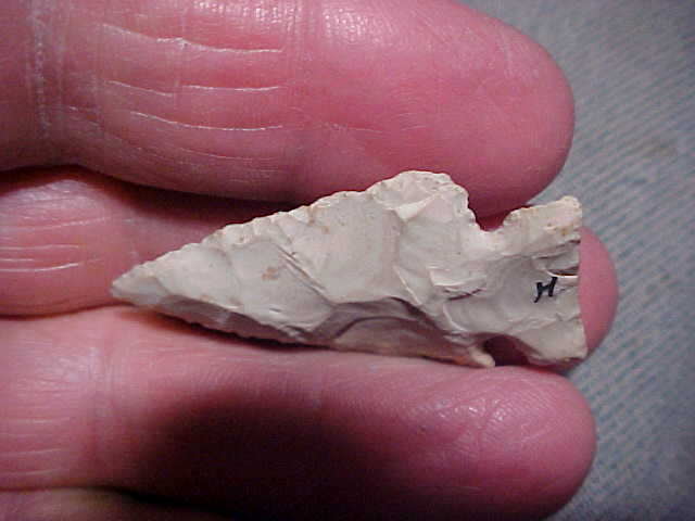 Out of Hopkins County, Kentucky--not sure if this was a creek find (like so much of the guy's collection), or a field find--clearly Early Archaic Culture, strong basal edge grinding to the light colored chert--an "H" shows (in ink) to indicate the county. Length is 1&11/16" by 7/8"--a thin dart point, only 3/16" max thickness. Good knapping work, good patina, real. Shipping is $8.00 with checks, cash, money orders or driveway gravel, but I do not use paypal-type services--Roy A.