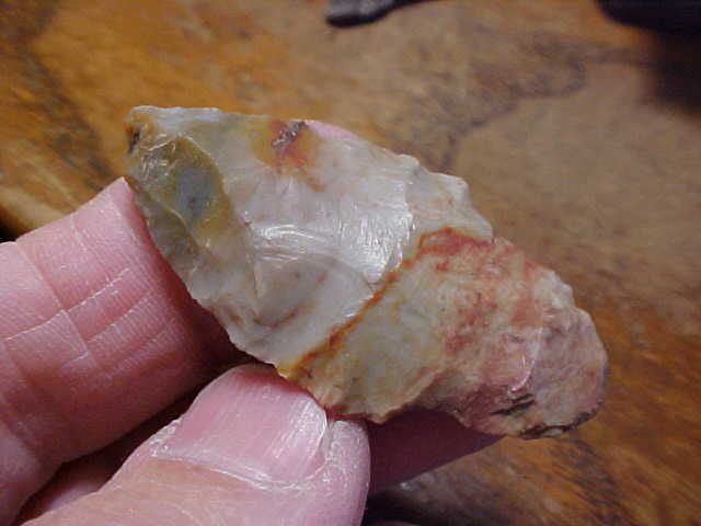 A Spencer or Perry County, Indiana, Adena--close to a Turkey Tail base, but the distinction is so close I'll go with "Adena",caliper reads it as just under 2& 1/16" by 1&1/16"--note the tip, a trace of the old impact fracture that resulted in the Woodland Cult. point being sharpened (and shortened)--whatever the hunter hit, he did it first class (with force), he broke the tip on a better than 5/16" thick blade--it too some force. The repair job, ancient, was well done, but when you examine ANY ancient artifact you ask yourself questions about how they used (and touched-up) damage. How long was the piece to start with--probably 3&1/2"-- this type of flint (Indiana Holland Chalcedony) has so many fracture planes in a big 'chunk' that getting long, thin blades is not common. The red color tells you one other thing-- the point/ knife was near a fire at one time, heat changed the color, iron oxides suddenly stood-out. A good piece, REAL in every detail. Shipping is $8.00, checks or M.O>s (or cash), but please note I do not use paypal if you're buying--Roy A.