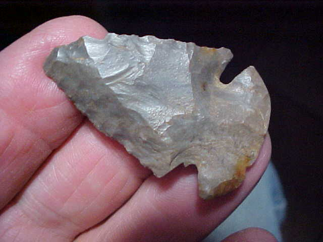 A Gibson County, Indiana, find according to the grandson of the finder--as the grandson was near retirement age, who knows how many decades it's been since this Dovetail was found? The flint is VERY mineralized, iron stained, and (while not a perfect point) still pretty collectible. Length is a well sharpened (reduced in size from the length at which it was first made) 1&11/16"---the 1&1/16' width and the 5/16" thickness testify to a 'double that size' original length--the heavy bevels are also telling the same story-LOTS of sharpen-and-use cycles. Basal grinding is excellent. The tip shows the last 'salvage' of the work blade (as a hafted knife)--that repair was done on a darker band (inclusion) in the hornstone--guaranteed ancient even if the the color shows darker than the surrounding surface chips. One barb end shows an ancient ding--again, the knife had a lot of use before it was lost. Shipping is $8.00 with checks, cash, or M.O.s welcomed. Sorry, I do not use paypal-type payments--Roy A.