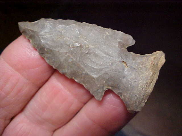 Yeah, that base is a tough 'match up'...no--or so little basal grinding that the piece has to be Late Archaic into Woodland, but not a "true" Motley point base, not a Hamilton, Smithsonia, or any of a half-dozen other point types from that era. In a fashion it's as though the point was a "reconstructed Hardin", but a Hardin would have basal edge grinding. The late B.Wilson found the point in Massac County, Illinois, along the Ohio River--the type hornstone is a western Kentucky material, 2&3/16" by 1", but only a quarter inch max thickness. Note the sharpening technique is Woodland Culture workmanship, percussion flaking, sharpened from each face out to the edge (quadra-facial)--so if that isn't Woodland work, nothing is. Call it a 'variant of a Motley', that's the best classification I can give the piece--but REAL in every detail. Shipping is $8.00 (USPS minimum these days), checks, cash, or M.O.s are welcomed however I do not use paypal-type services--Roy A Oh--one last comment, Go Hoosiers!!!