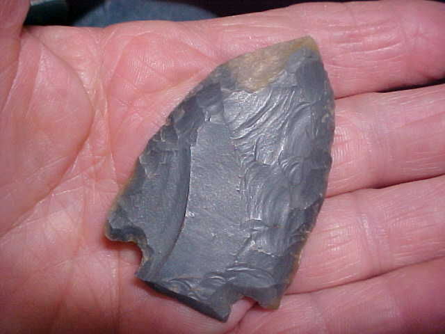 Right up front I'll admit I bought the piece from the estate of a local collector because I couldn't "type it"--the flint was the "Kentucky Blue" version of Sonora Flint, that one was easy (it outcrops at the northern end of Ft. Knox)--2&3/8" by 1&1/2", but the thinness is what makes the piece--3.5 sixteenths inch thick--that's REALLY unusual. The flaking is a mix of some percussion and pressure chipping, fine pressure-made edges--you wouldn't get so tiny-formed chips with a percussion technique. So, where does that leave the point in a 'cultural affiliation'? Benton Culture, the Mid Archaic (6500BP) people weren't known for snap base points (blunts, blunts, and MORE blunts--and parallel oblique flaking), so I do not time-scape the blade as Benton. Kirks, they were (quite likely) the biggest users of a snap base technique. Without a stem to give you more information on cornernotching I'm going to settle on Kirk unless someone presents a more compelling argument. The finder marked the piece as a Henderson County, Kentucky, find--it's real, regardless of how you want to 'type it'. Shipping is $8.00 with checks or M.O.s the ways I welcome-in payments. Sorry, I do not use paypal-type services--Roy A.
