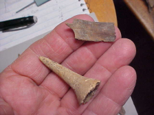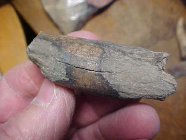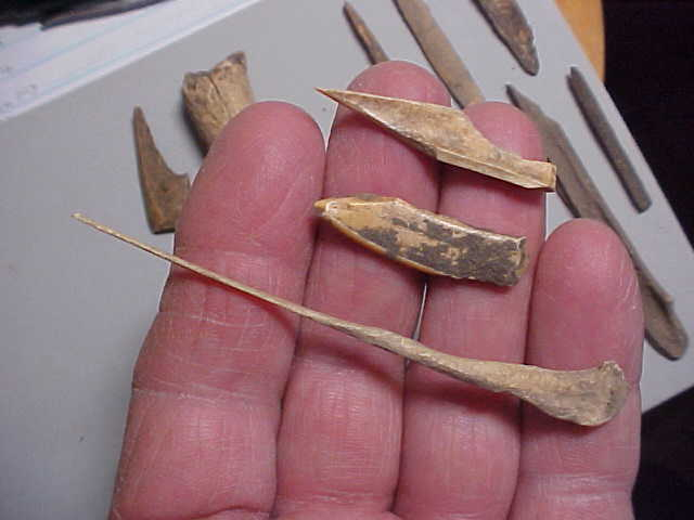 Cold weather, you start going back through your collection looking at pieces you had practically forgotten--old story. These 1984--1985 Ohio River bank finds are from an eroding midden, a site that was a mix of Adena and Hopewell--and a smattering of Riverton Culture (Late Archaic into Woodland). The midden was thick enough that several hundred years worth of 'house debris', firepits, flintchips and broken hammerstones could indicate either of the two major components (Riverton peoples tended to build shell 'mains' for their trashpits, so I kind of rule them out as the source of these tools). Remember, you didn't have plastic, so you made tools out of the most common raw material you had--animal bone (or bird as in the case of the 3&3/8" bird (Turkey?) legbone that became a hairpin--a neat piece in and of itself. The two cut-off antlers I'm guessing were some sort of flintknapping tools--there had to be some reason they went to the trouble of cutting them free. The fire blackened antler beam (2&5/16") had extensive carving on both ends--frankly any guess we'd make has a 50% chance of being correct. The small perforator was part of a turtle shell if I'm correct--thin. There were some fragments of other awls collected that day, but so broken, so mineralized it's hard to recognize what they were--for another $5 you can have them too. Shipping is $9.00 with checks or M.O.s welcomed. Sorry, I do not use paypal-type services--Roy A.