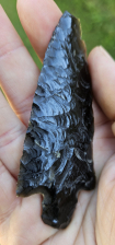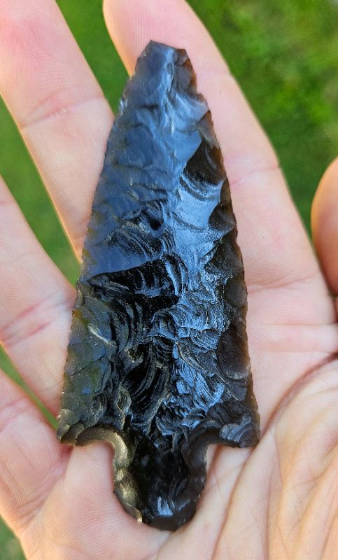 Super fine and uncommon Teotihuacan spearhead. Legally recovered in Guatemala and is beautifully pressure flaked. Their technique was an interesting one and results in a very fine edge a bit different than what we see here. Made from bright green banded Guatemalan obsidian. Measures 3 1/4 inches long. Don't miss this amazing piece of mesoamerican history!