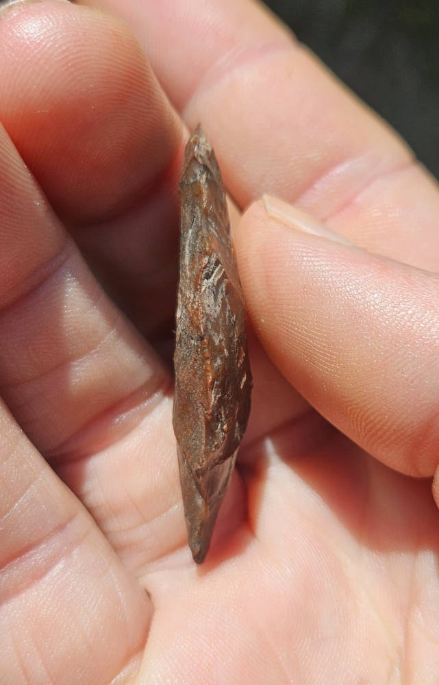 Fine little dart point that was legally recovered in Teller Alaska many yrs ago. Very unique and well made shouldered dart made from AK chocolate chert with some interesting bands. Measures 1 7/8 inches long. Nice piece!