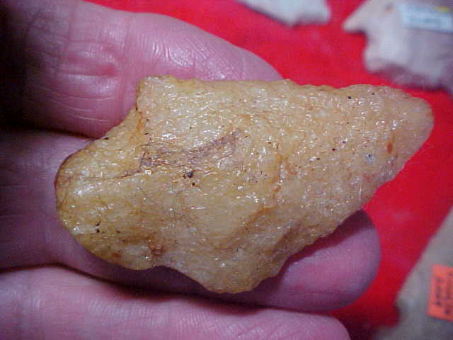 A St. Claire County, Illinois, Sugar Quartz Adena (or Dixon) point,2" by 1&3/16"--roughly 7/16" center thickness--backlighted the piece is somewhat translucent. The stem base has a lot of either polish, or a section of the exterior of the original Mississippi River cobble that was used to make the piece, Great patina, real, period. Shipping is $7.00, checks or M.O>s are welcomed. Sorry, I do not use paypal-type payment services--Roy A.